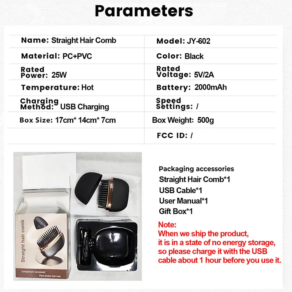 Package Includes: 1 x Wireless Hair Straightening Comb, 1 x USB Charging Cable, 1 x User Manual